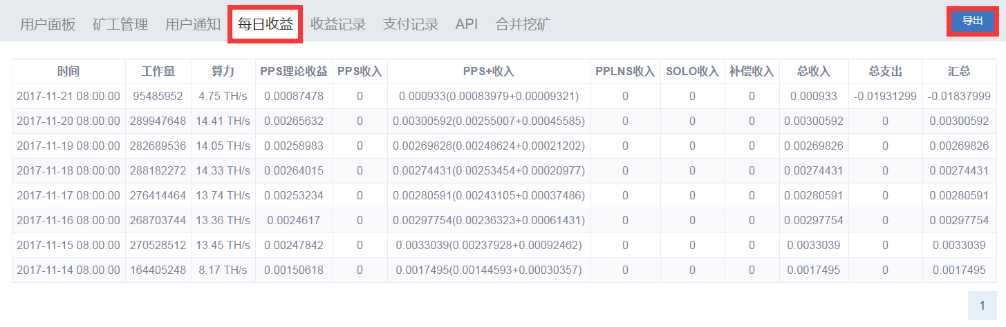 사용자 패널--수익 기록--일일 수입;이 기능을 통해 사용자는 매일의 작업량, 평균 계산력, PPS 수익 이론치 및 PPS+ 수입(PPS 수입 + 거래 비용 수입)을 조회할 수 있고 매일의 수익에 대해 직관적으로 손쉽게 비교하여 적시에 수익 이상을 발견할 수 있습니다.